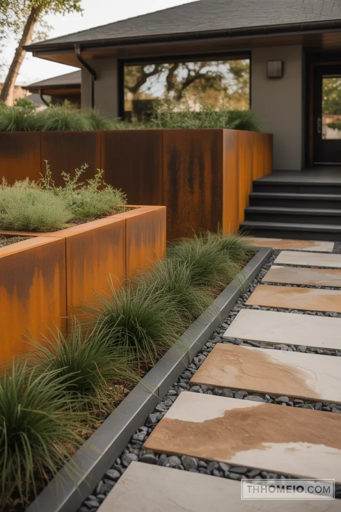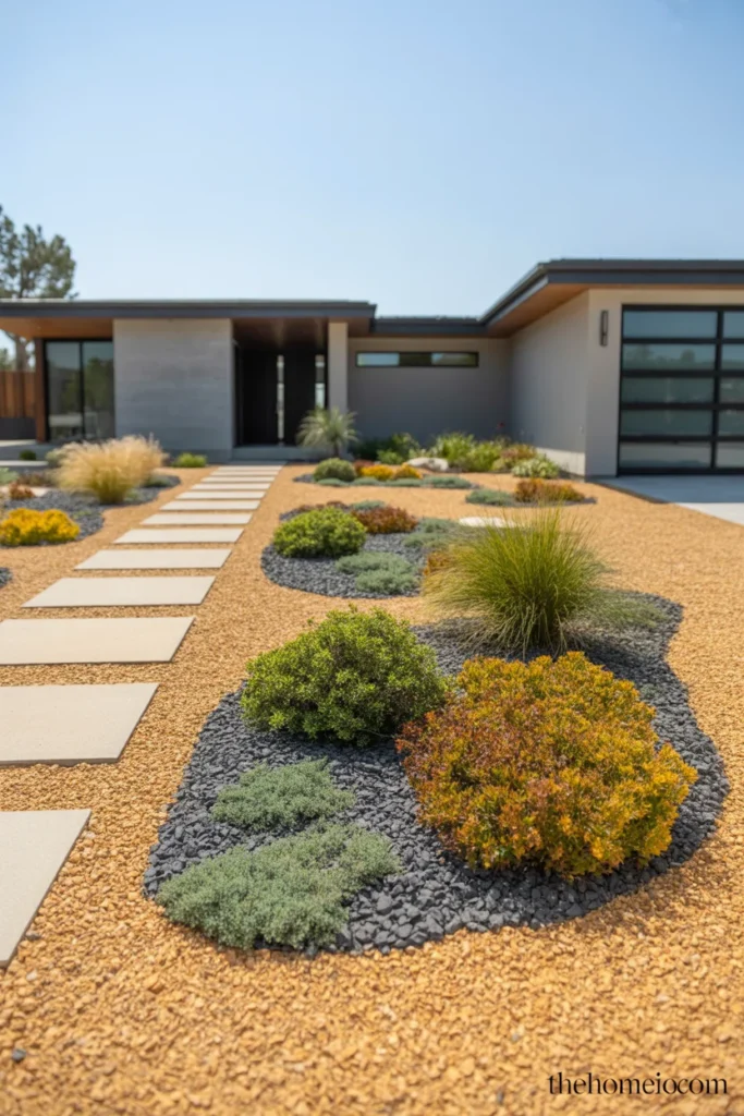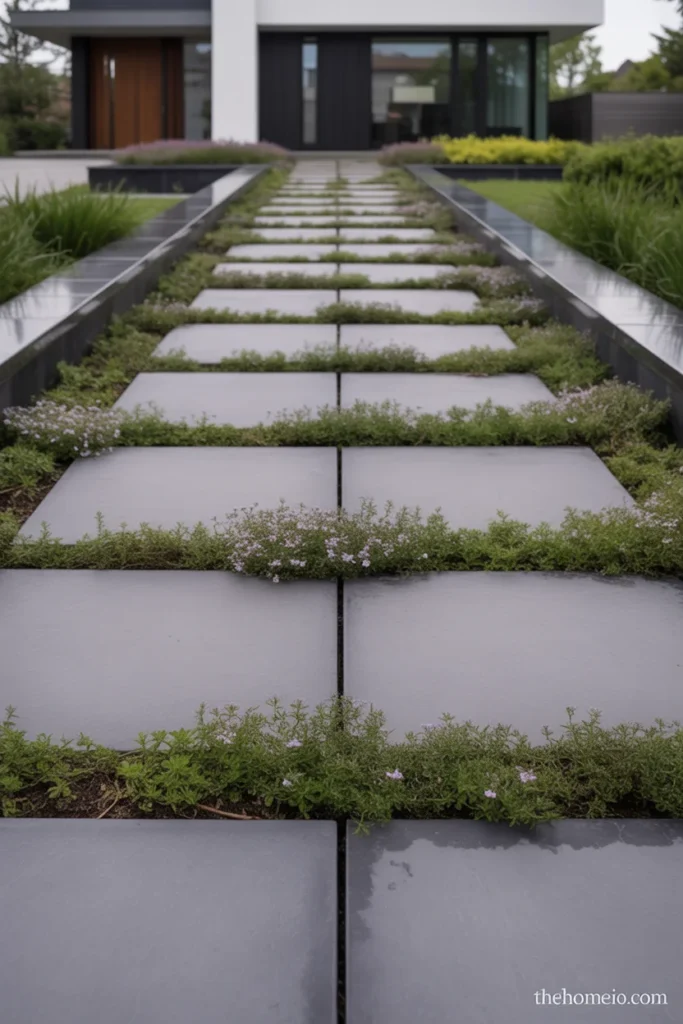 Set them with consistent spacing and fill the joints with decomposed granite, crushed gravel, or low ground cover like creeping thyme. The combination of hard material and soft living infill is one of the defining details of modern front yard landscaping ideas done well.