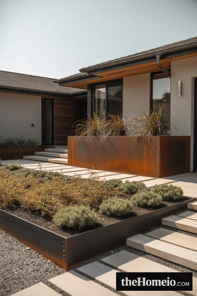 Modern landscapes use materials that get better with time rather than materials that need constant refreshing. Corten steel planters develop a rich rust patina. Natural stone develops character with weathering. Black steel edging holds its color indefinitely. Concrete pavers settle beautifully into the ground over time.