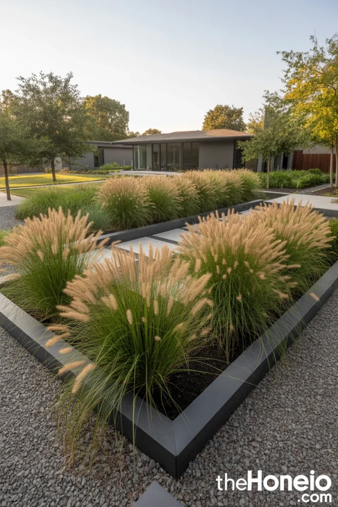 Karl Foerster feather reed grass, blue oat grass, and Mexican feather grass are three of the most popular choices for modern front yards. Plant them in bold groupings of three or five rather than single specimens for the strongest visual impact. They reach maturity in two to three seasons and look better every year after that.