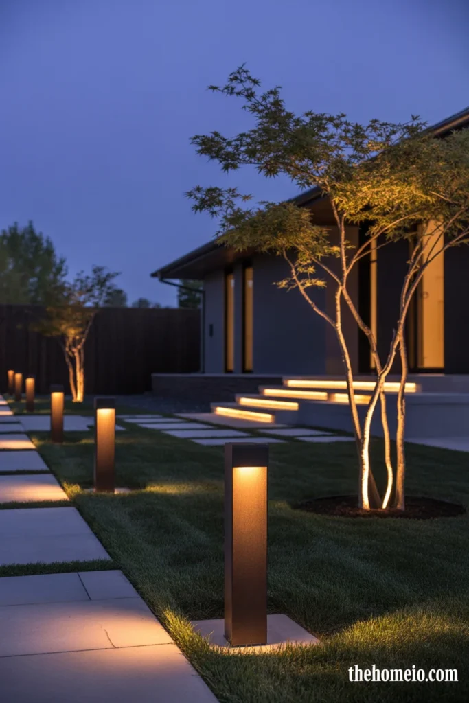 Modern landscape lighting stays low, warm, and subtle. Bollard lights along the walkway, in-ground uplights aimed at a key tree or shrub, and recessed step lights create layers of warm illumination that make the front yard look stunning after dark without overwhelming the design.