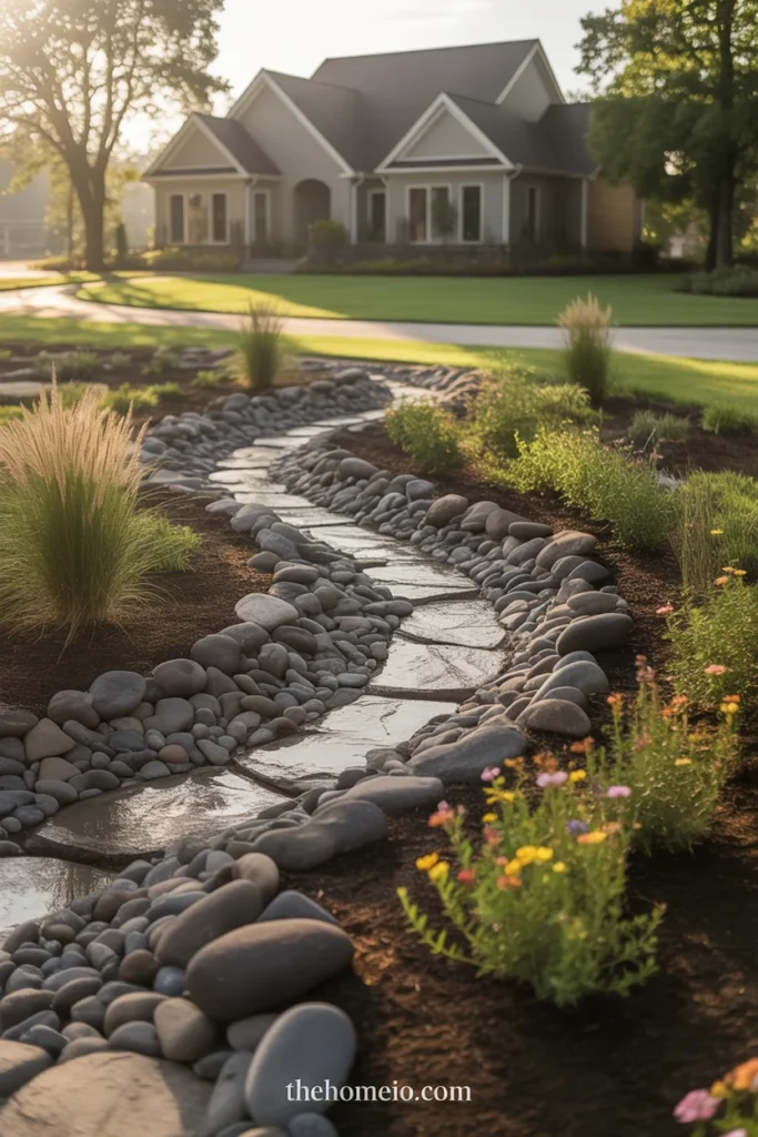 A dry creek bed is one of the most impressive things you can add to a front yard and it is far easier to build than it looks. Dig a shallow winding channel across the yard, line it with landscape fabric, then fill it with a mix of large river rocks on the outside edges and smaller smooth stones in the center to mimic how a real creek would look.