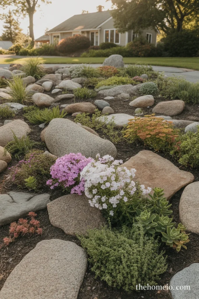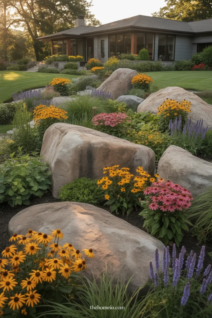 Place two or three large boulders of varying sizes in an organic cluster near the center or corner of the front yard. Then plant around them with coneflowers, black-eyed Susans, ornamental grasses, and salvia. In spring the early perennials wake up around the boulders. In summer the blooms are full and colorful. In fall the grasses and seed heads add texture. In winter the boulders themselves hold the composition together beautifully even when everything else has gone dormant.