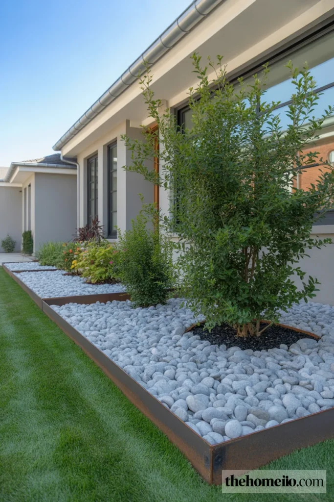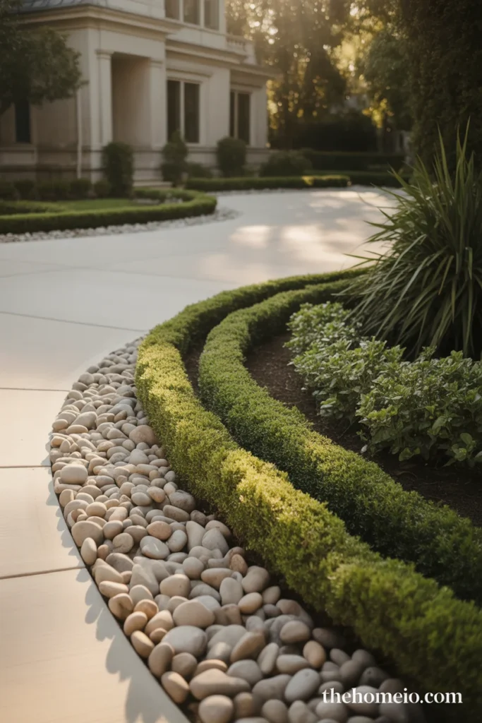 The driveway is one of the largest visual elements of any front yard and most homeowners completely ignore the edges. Framing both sides of the driveway with a defined rock border immediately elevates the entire front yard. Use large river rocks or boulders to create a clear, bold edge, then backfill behind the rocks with smaller decorative gravel or plant low ornamental grasses and ground covers.