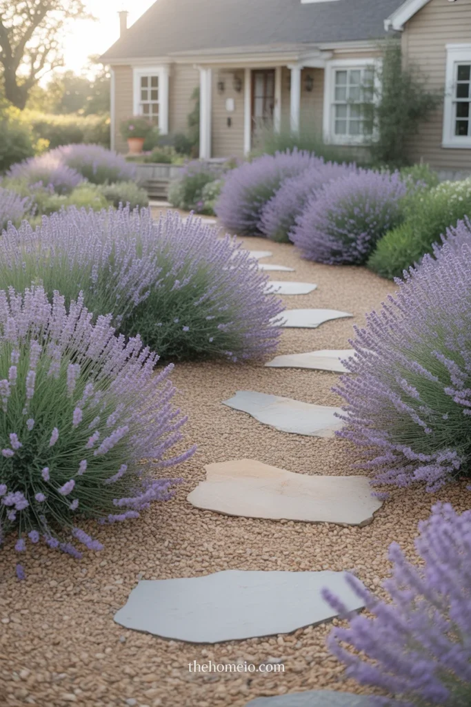 Plant English lavender or Hidcote lavender in groups of three or five, surrounded by decomposed granite or pea gravel. Add a few flat fieldstone pieces as stepping accents through the planting. This combination is naturally drought tolerant, deer resistant, and requires almost no maintenance once the plants are established usually after the first full growing season.