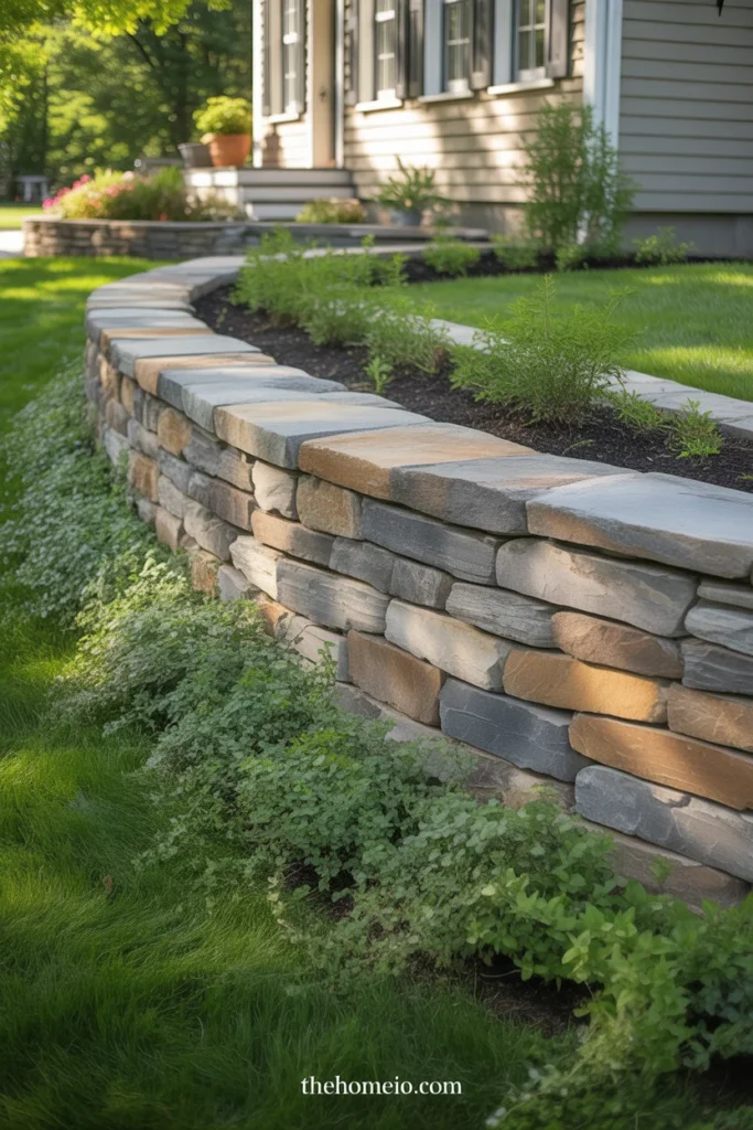Use locally sourced fieldstone or flagstone for the most natural look and the lowest cost since shipping heavy stone long distances adds up fast. Stack the stones dry, without mortar, for a traditional look that also allows for easy adjustment over time. Plant low ground covers or trailing perennials right at the base of the wall so the plants soften the edge and the whole thing feels settled and established.