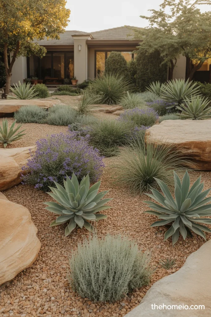 The most common mistake homeowners make with xeriscape rock gardens is planting too few plants and using too much bare rock. A well-designed xeriscape front yard is about sixty percent planted and forty percent rock not the other way around.