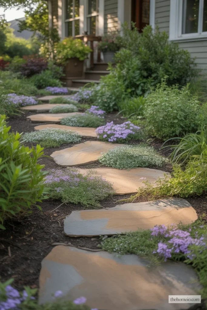 Choose irregular natural flagstone in a warm gray or tan tone for the most timeless look. Set each stone deep enough that the top surface sits flush with or just slightly above the surrounding soil, this prevents tripping and keeps the path looking clean. Plant low thyme, creeping phlox, or Irish moss between the stones to soften the joints and add color.