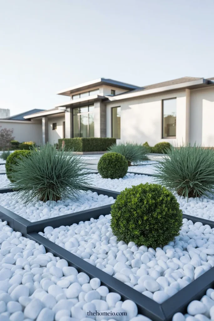 White decorative rock whether white marble chips, white river pebbles, or white crushed limestone has a clean, high-contrast quality that works especially well in modern and contemporary front yard designs. Against dark green plants, black steel edging, and a dark or white house exterior, white rock reads as sharp, intentional, and genuinely sophisticated.